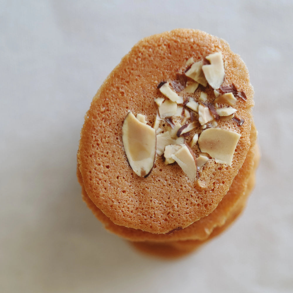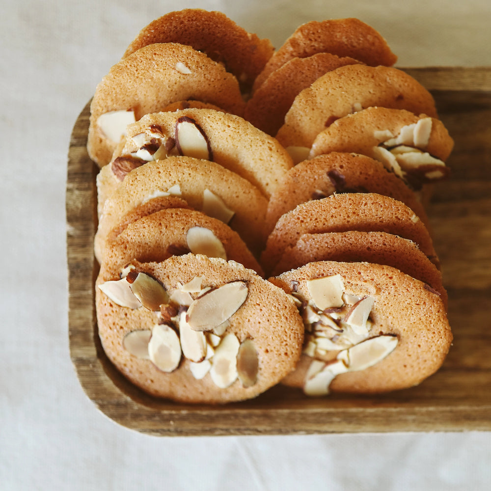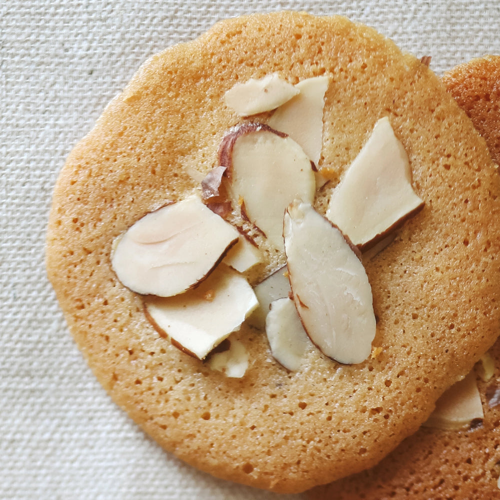 Thin almond base cookie crisp topped with slivered almonds.