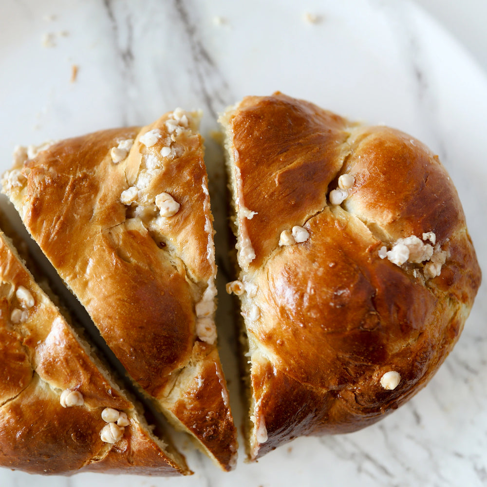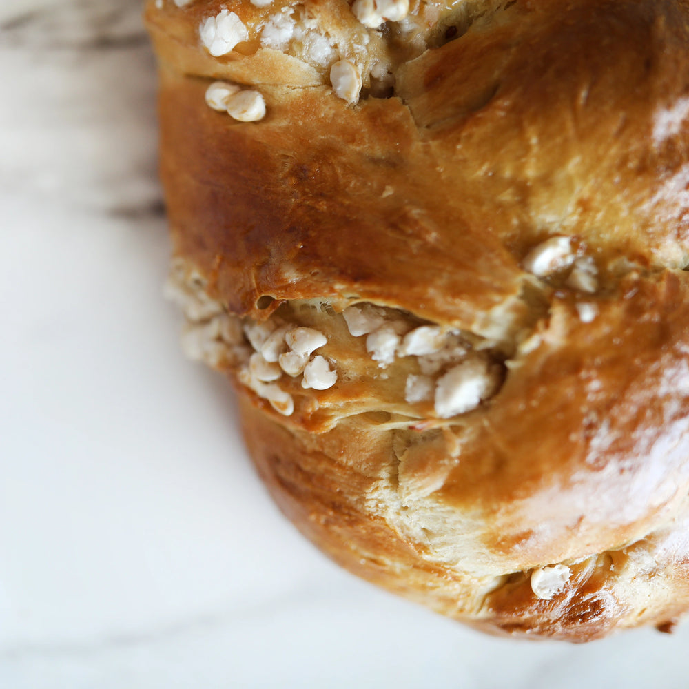 A soft, golden challah braided with creamy white chocolate that melts into the dough. Every bite is sweet, smooth, and perfectly indulgent.