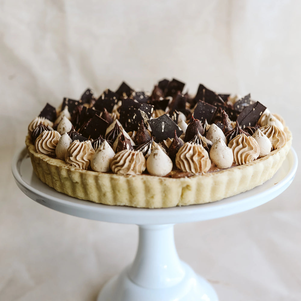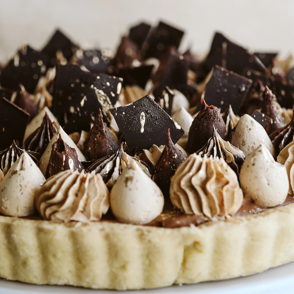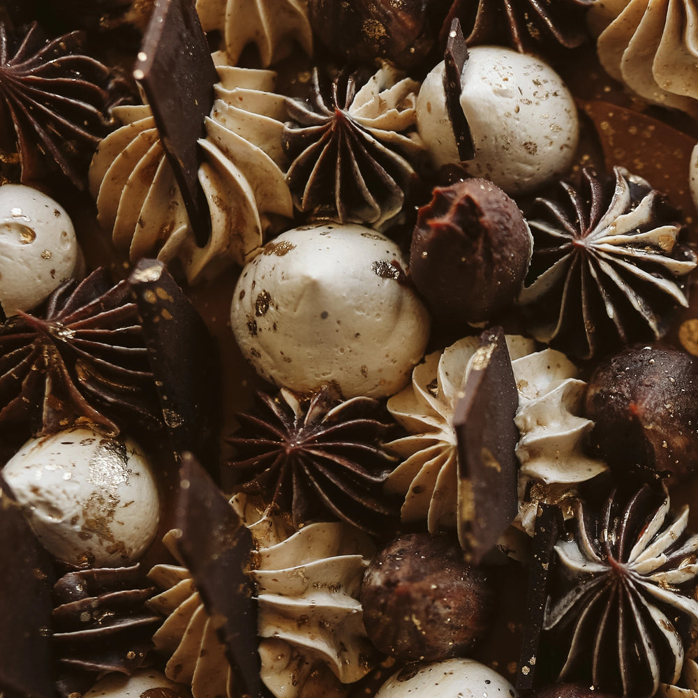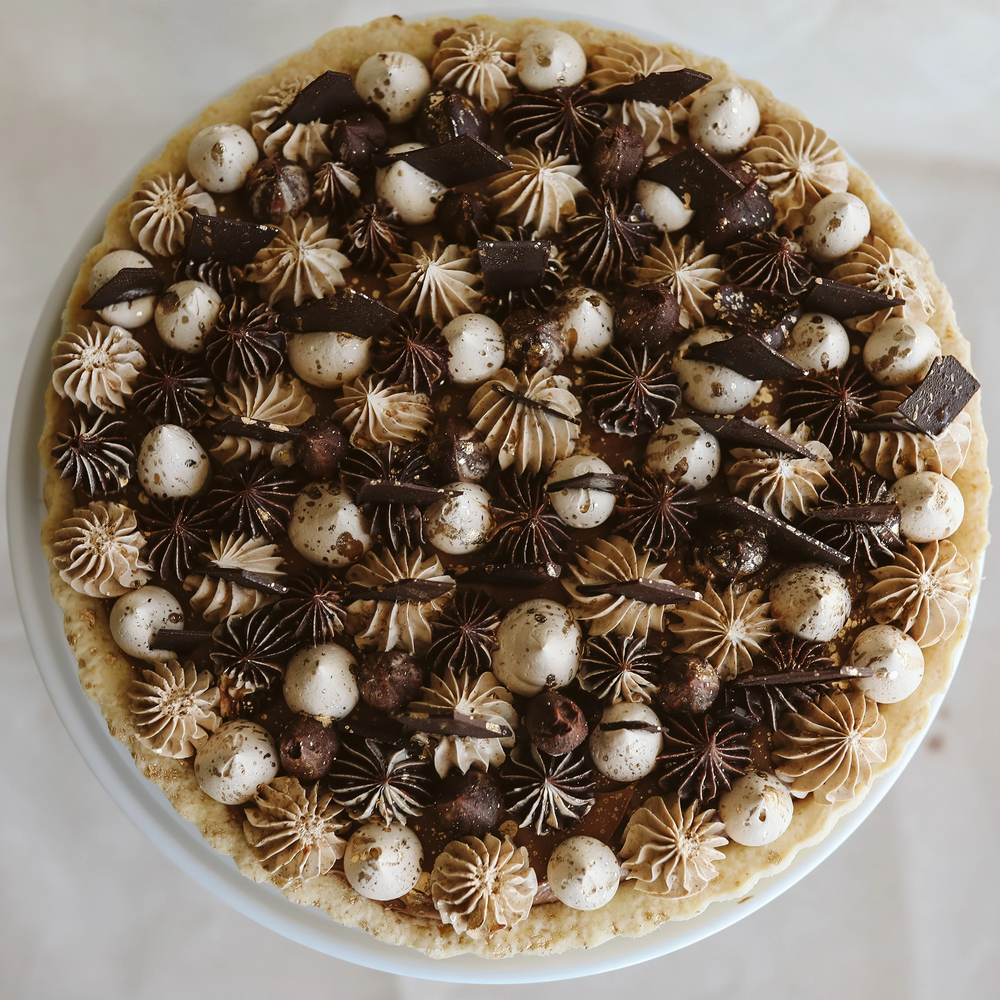 Vanilla crust base filled with decadent chocolate fudge and topped with chocolate and hazelnut drops.