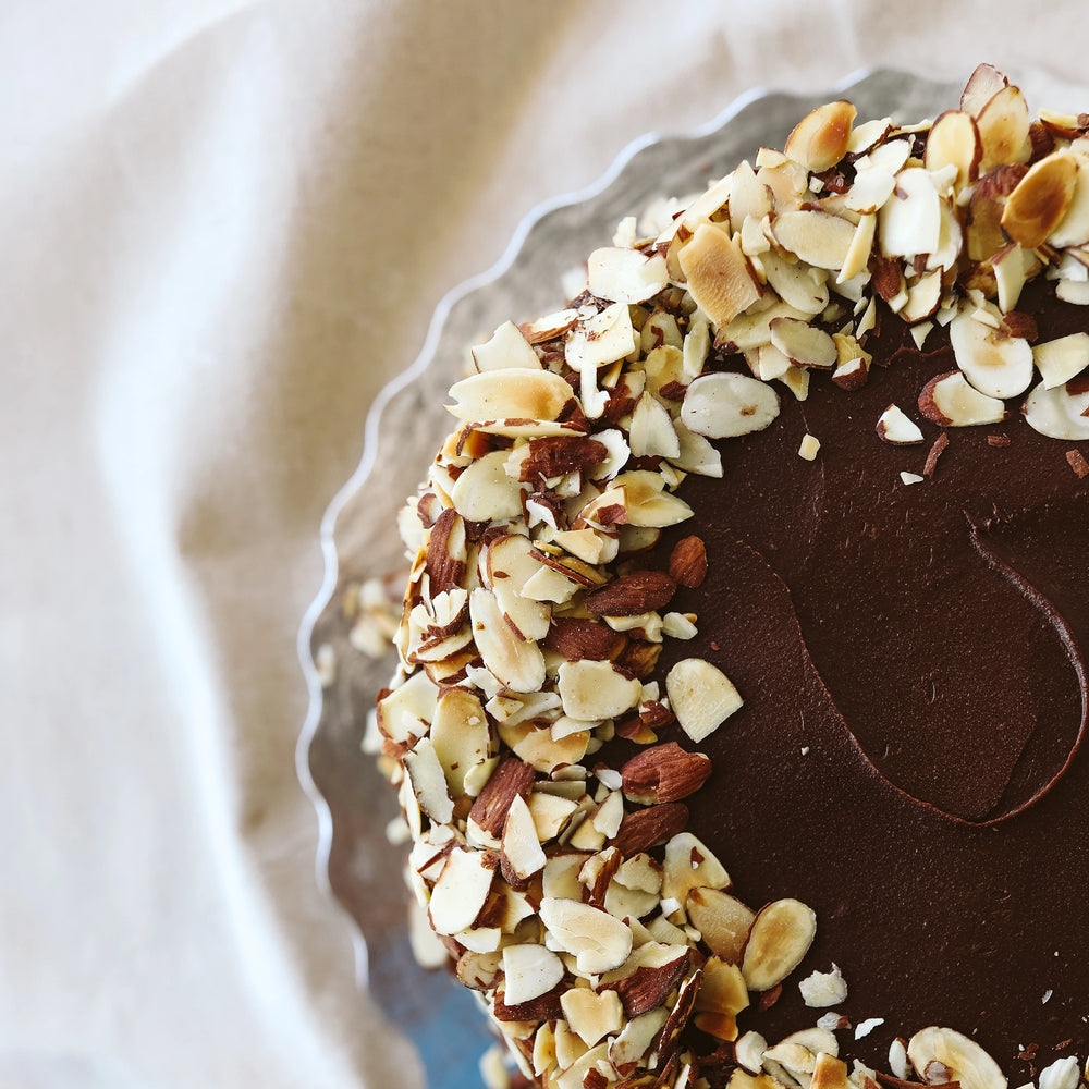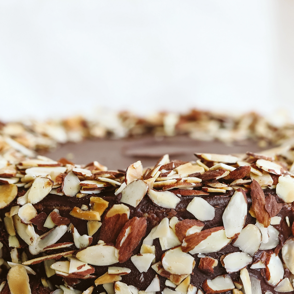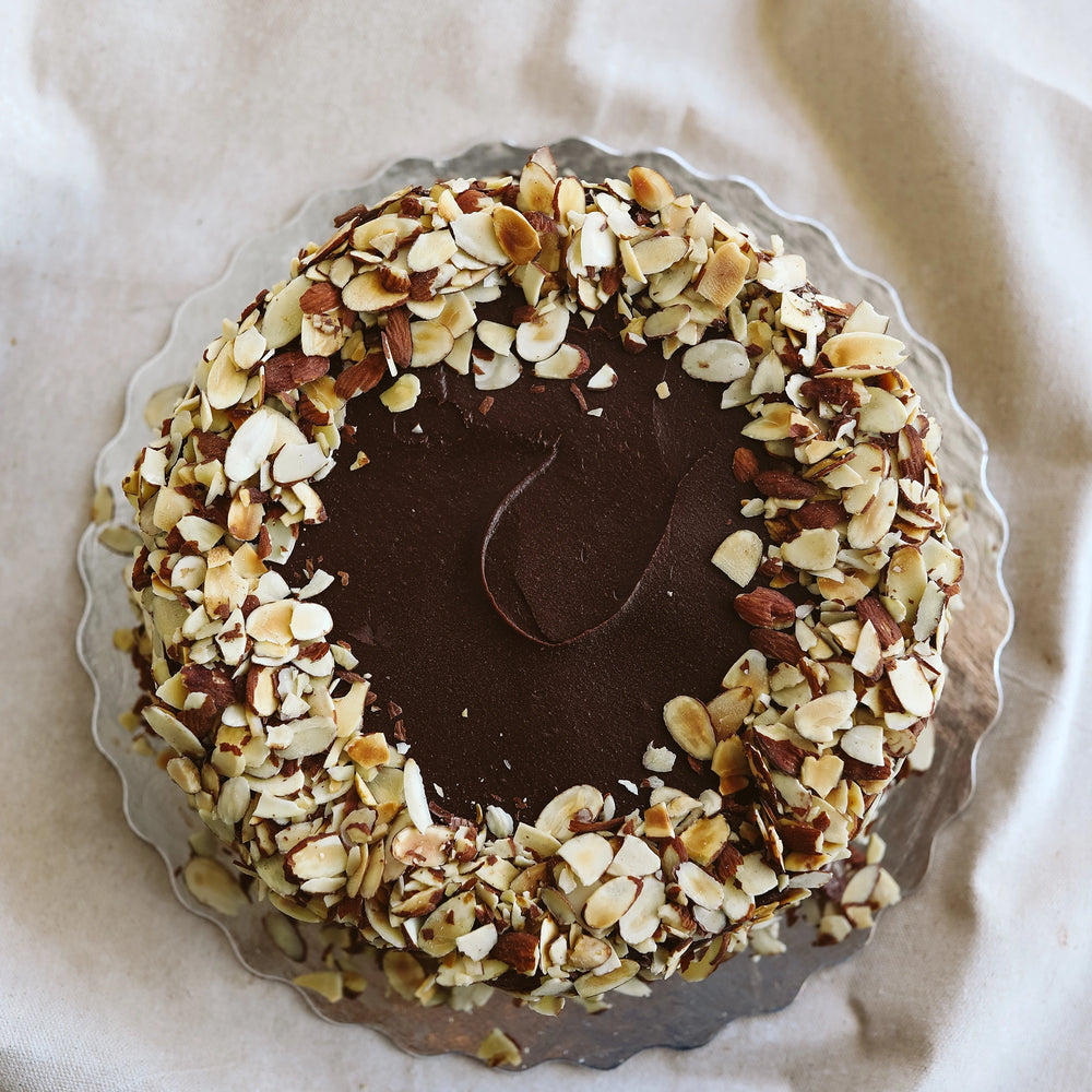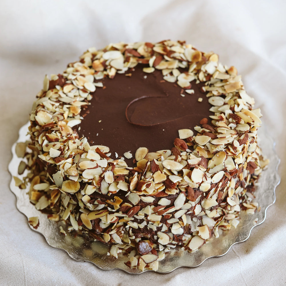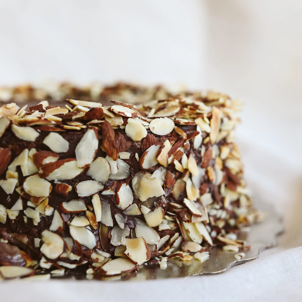 Layers of hazelnut dacquoise filled with a dense chocolate and coffee cream.