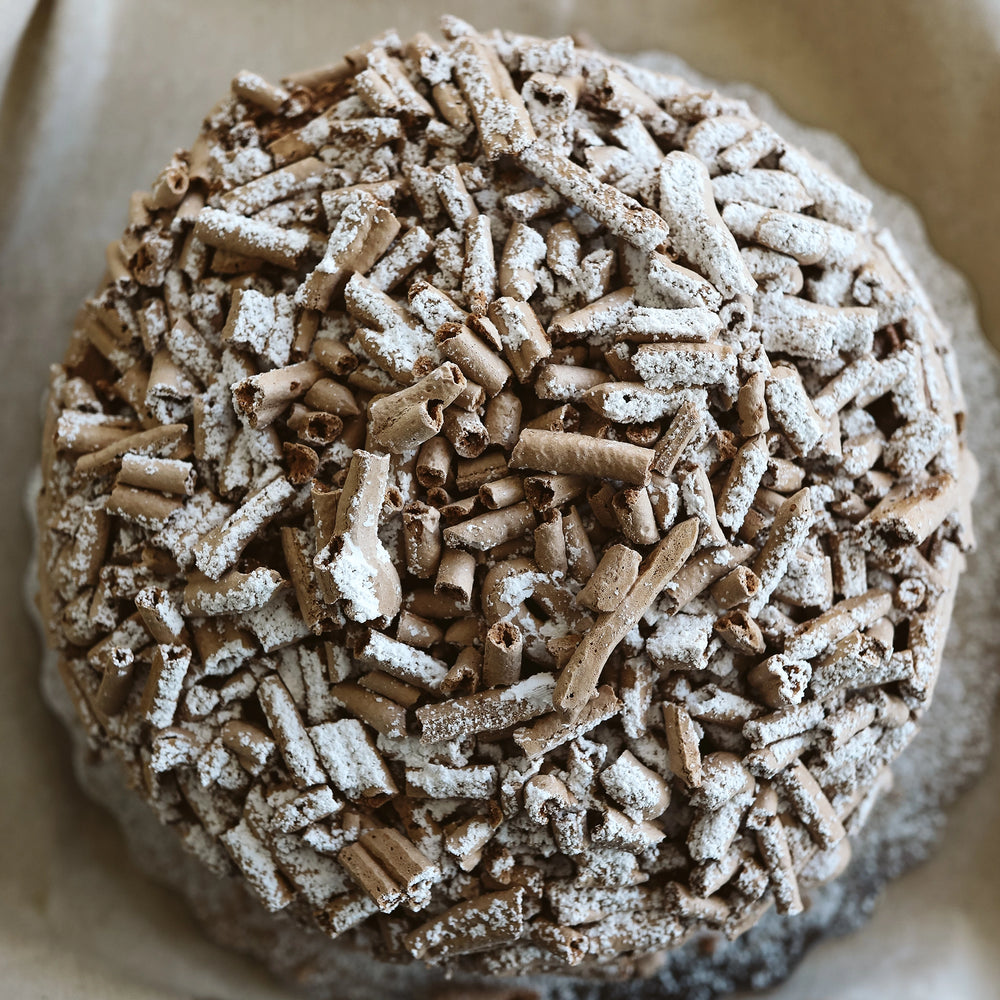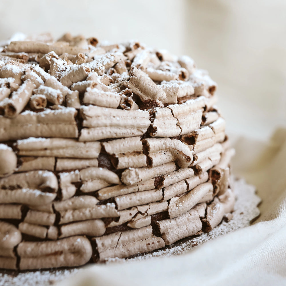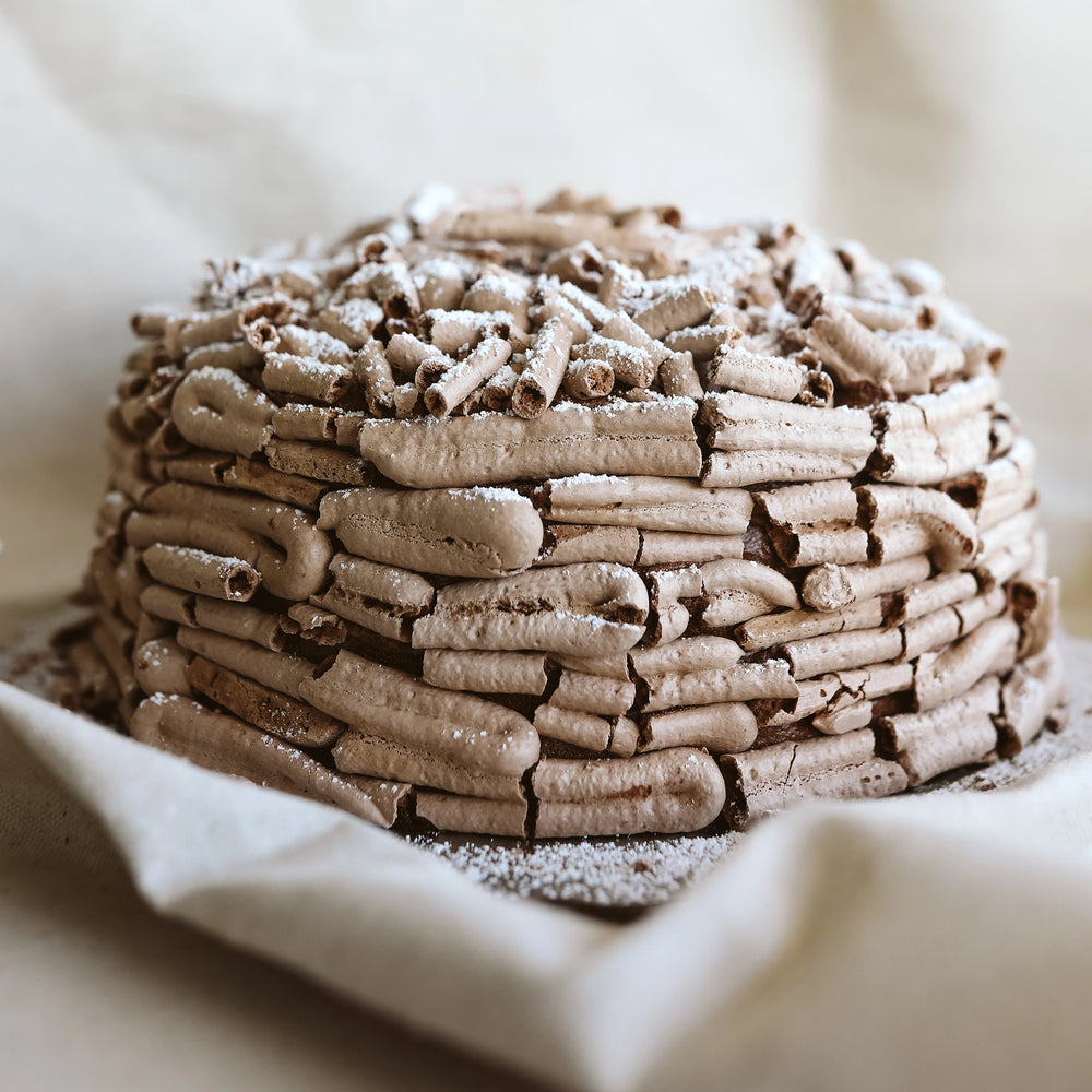 Layers of chocolate meringue with chocolate mousse and decorated with sticks of meringue.