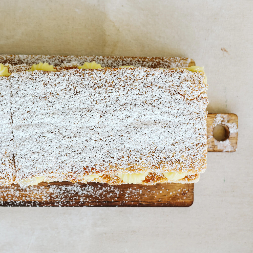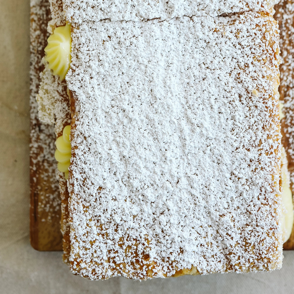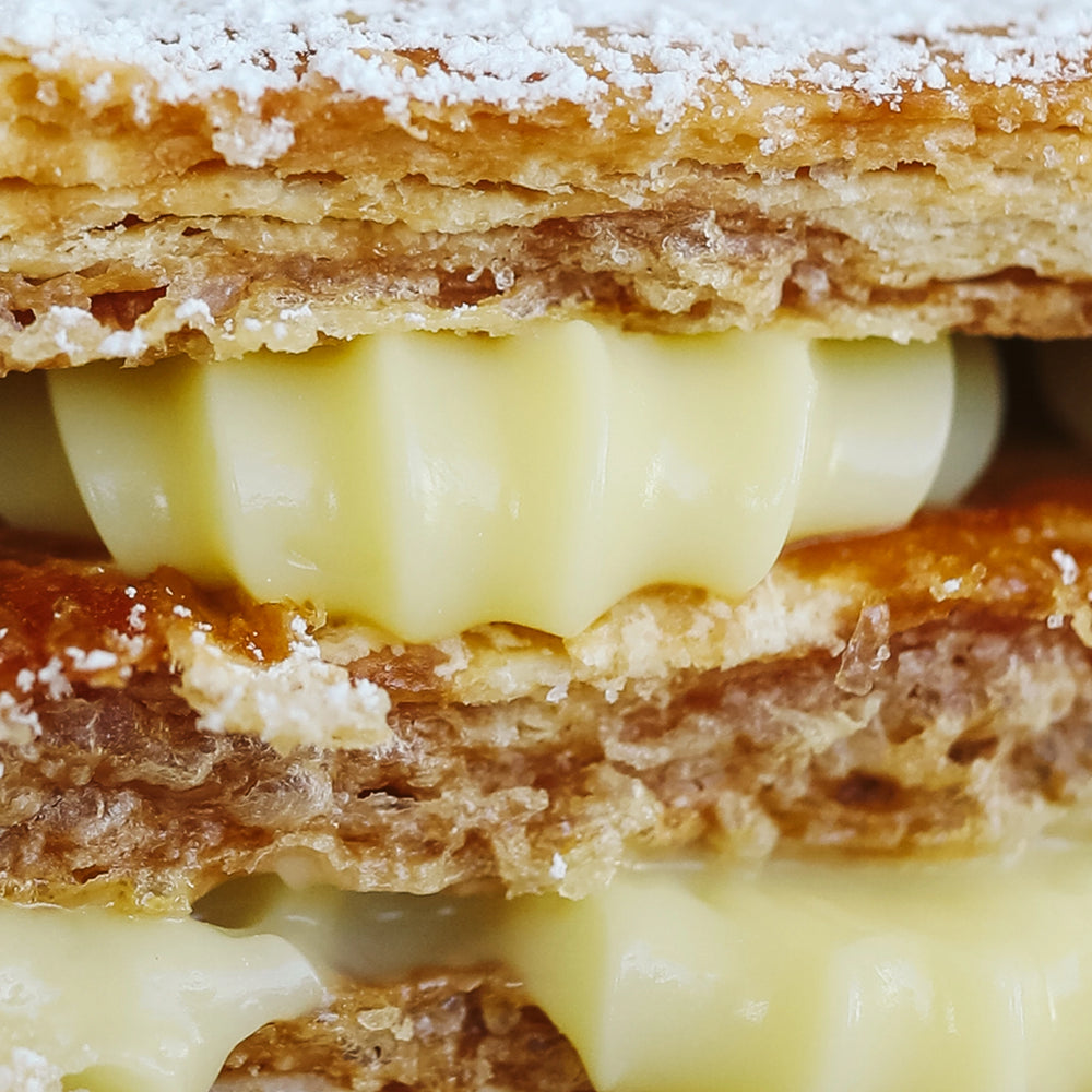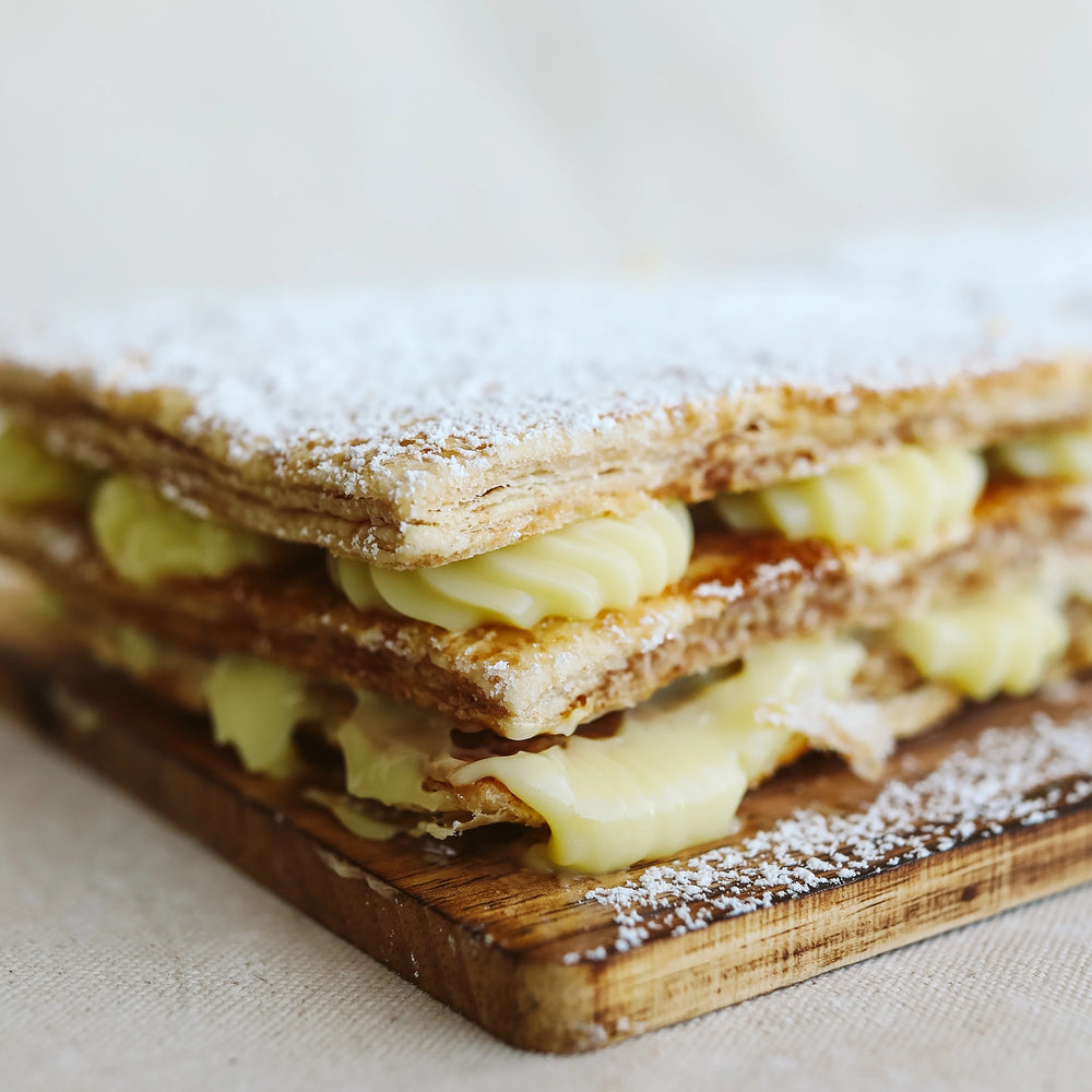 Crisp puff pastry layered with luscious vanilla cream. A refined, flaky indulgence that’s both airy and rich.