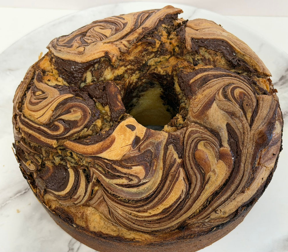 A marble cake with swirls of rich chocolate and soft vanilla, baked together for the perfect blend of flavors. Every slice is a mix of light, fluffy sweetness and deep chocolate goodness.