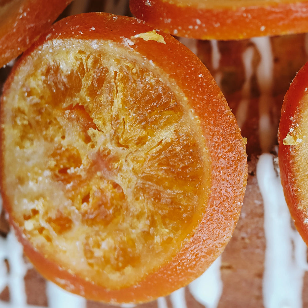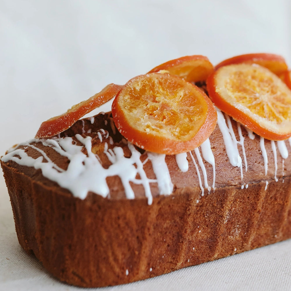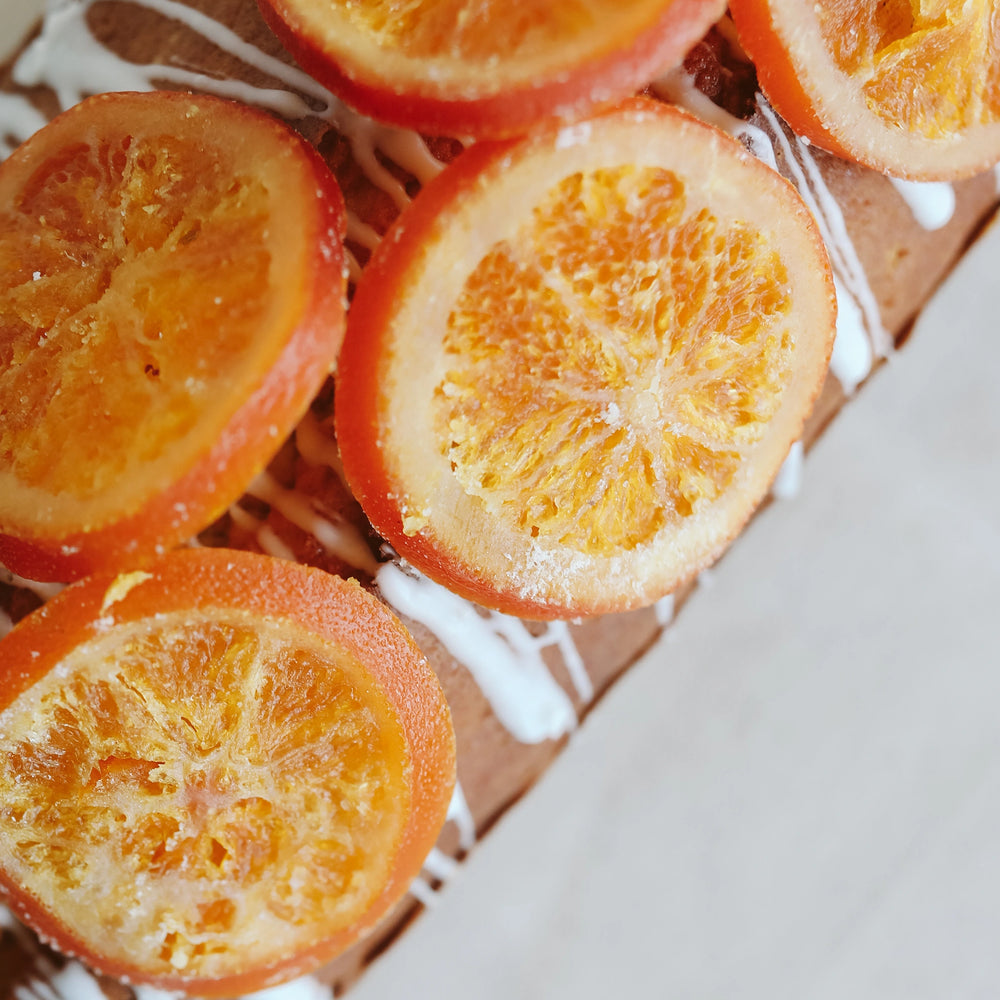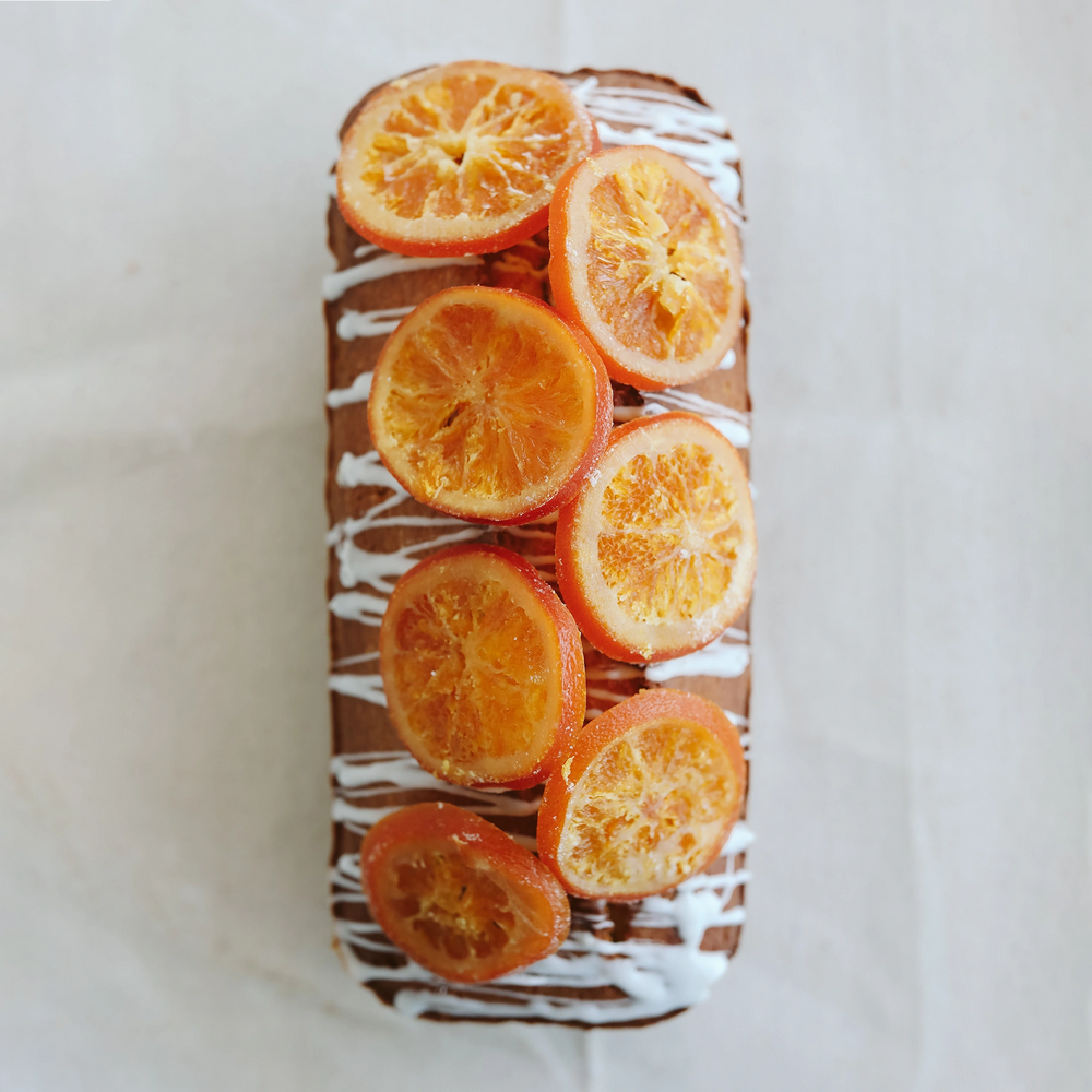 Bright citrus meets a soft, buttery texture in this fragrant loaf. topped with our homemade caramelized orange slices.