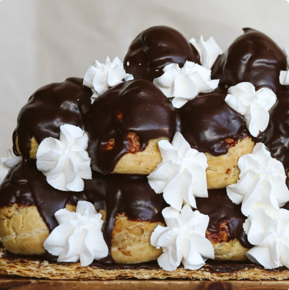 Choux pastry balls filled with pastry cream and decorated with chocolate and whipped cream roses.