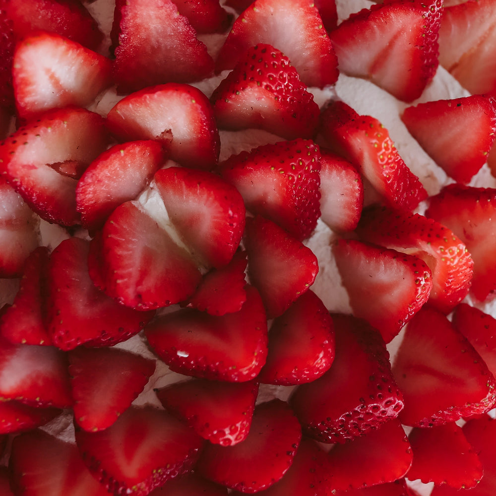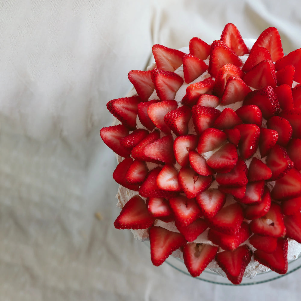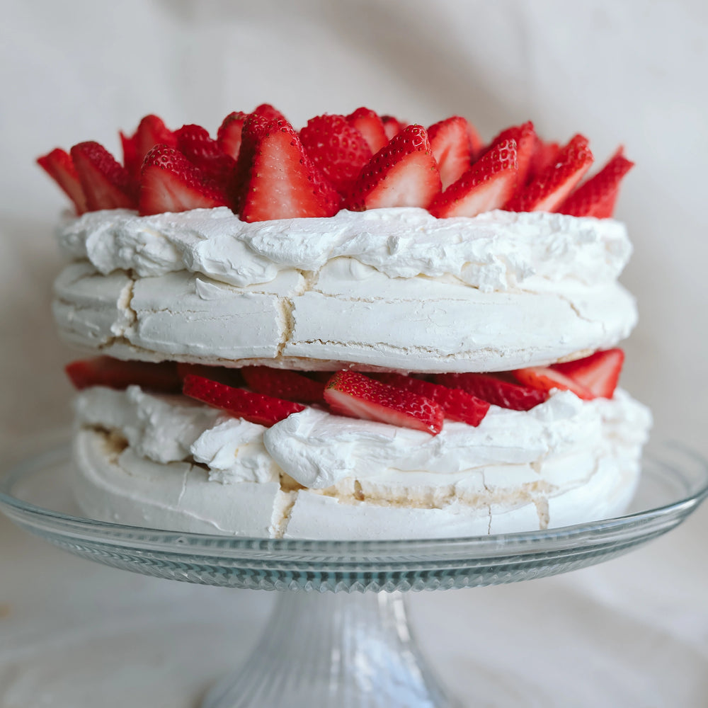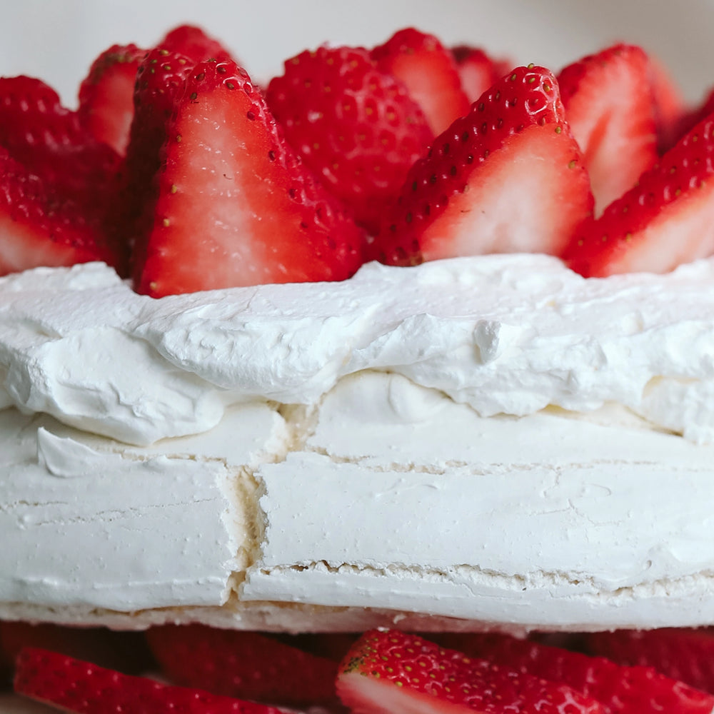Layers of traditional meringue filled with whipping cream and lots of strawberries.