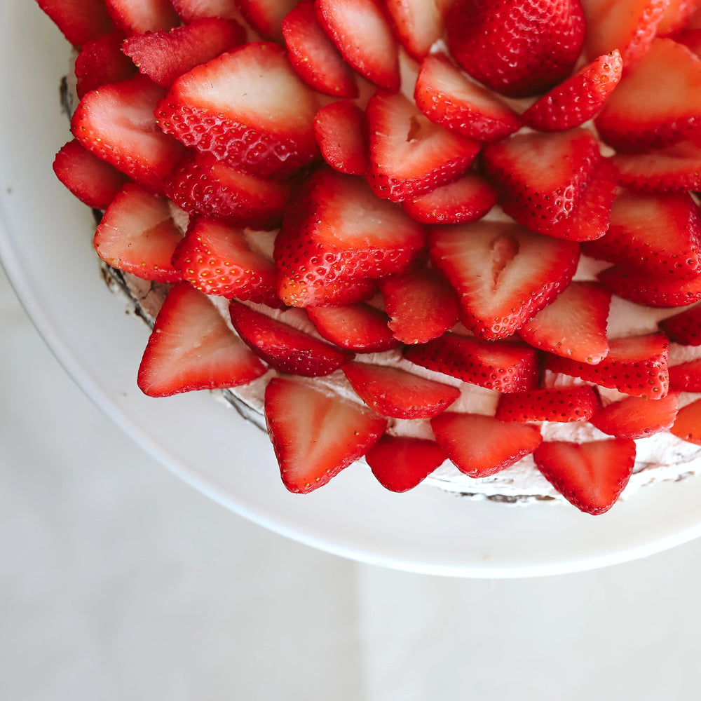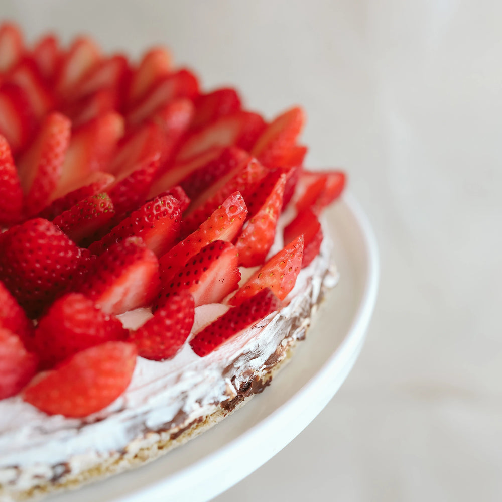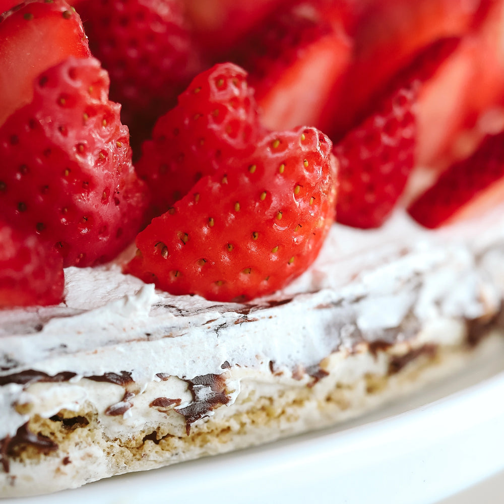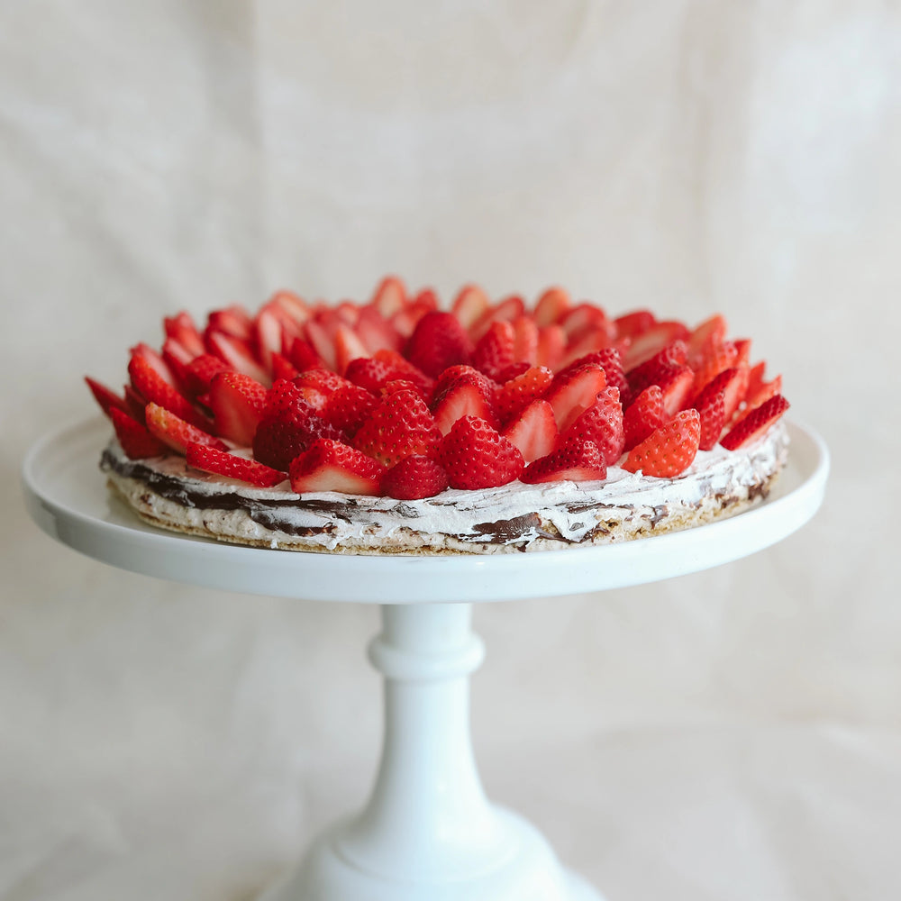 Crunchy walnut meringue topped with Nutella and covered with strawberries.
