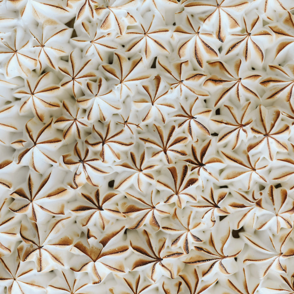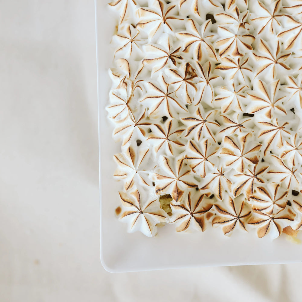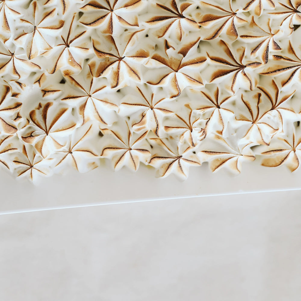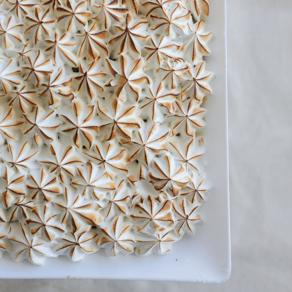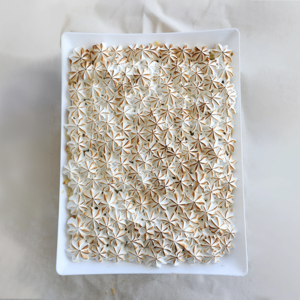 Moist, vanilla fluffy sponge cake soaked in a mixture of three types of milk, topped with a torched meringue. Served on a bowl.
